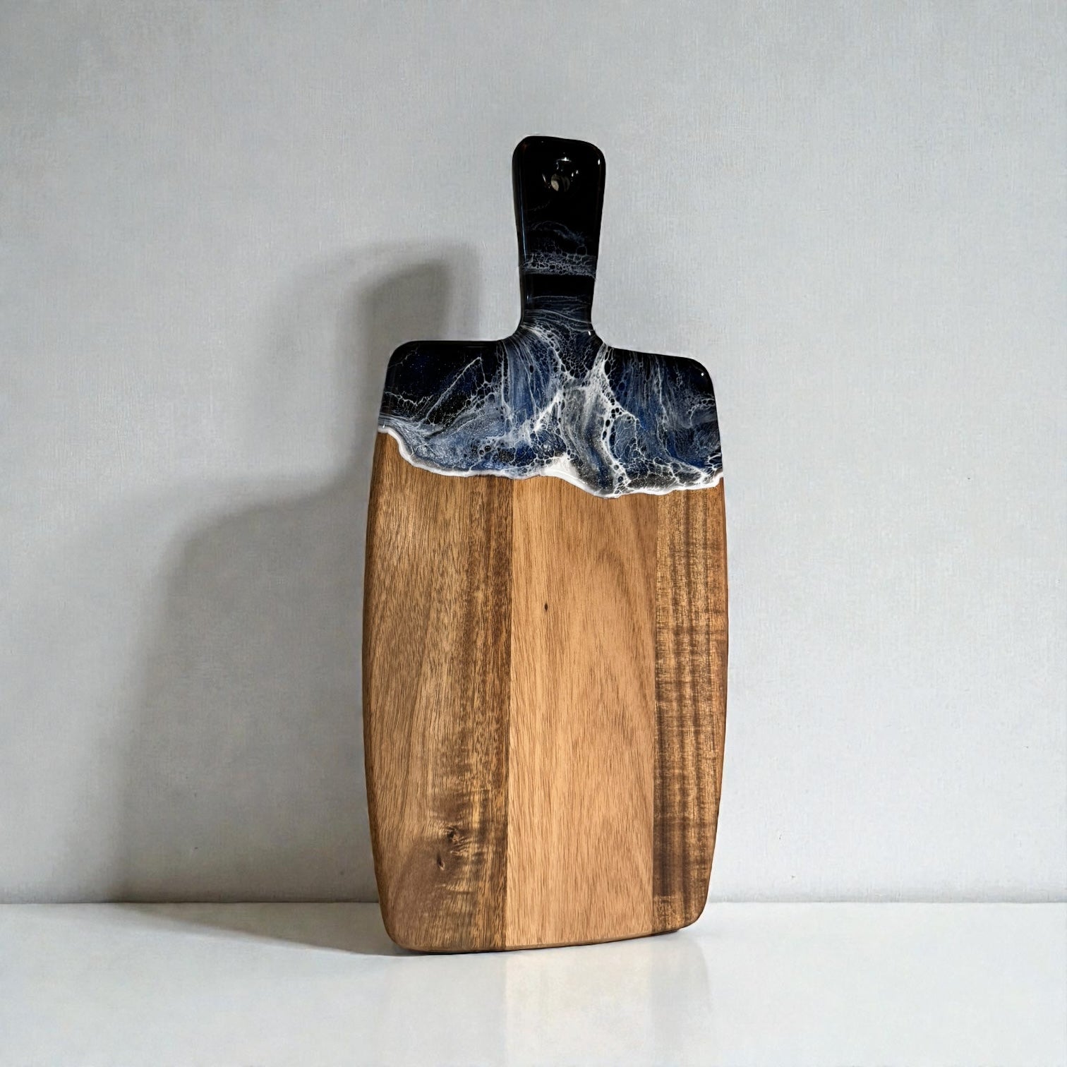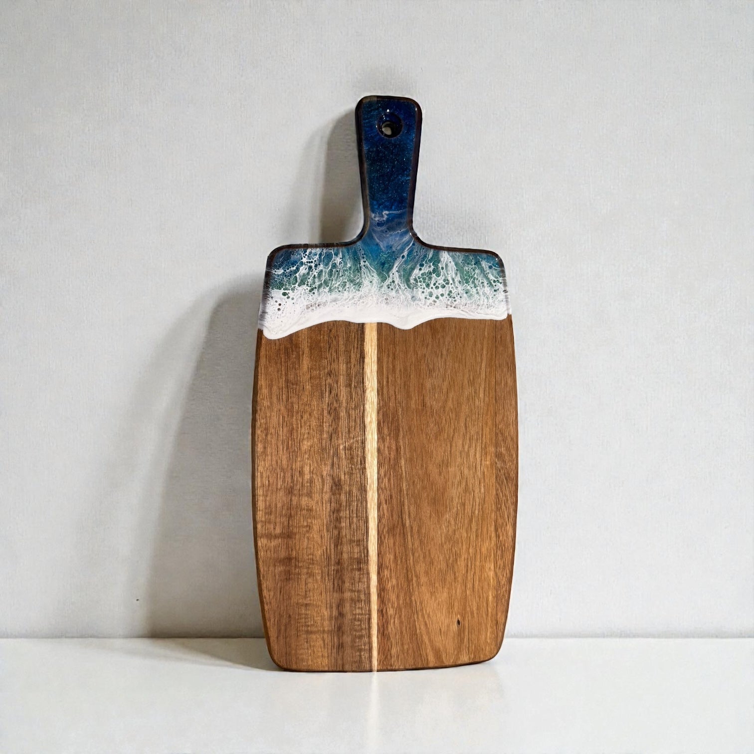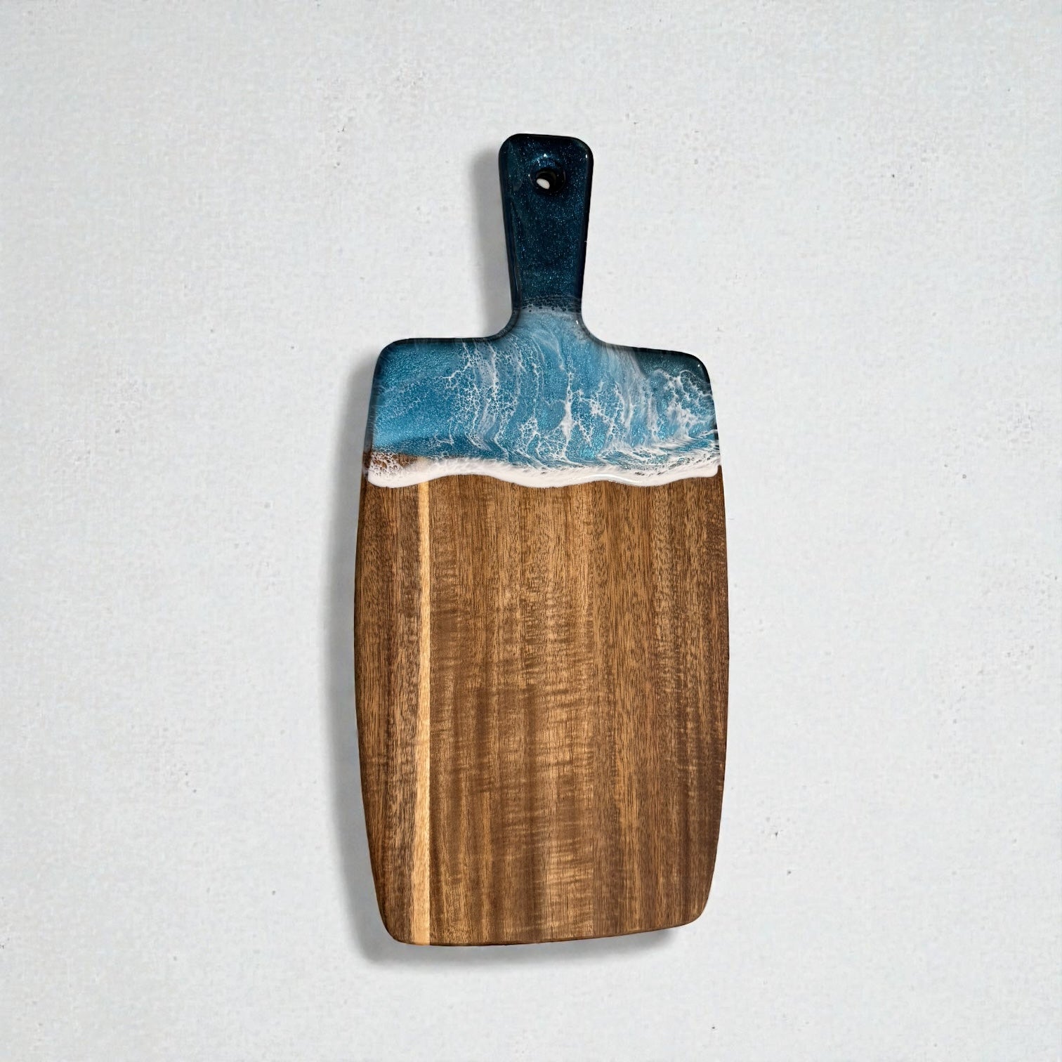 Enhance your charcuterie experience with this acacia serving board featuring a stunning resin wave design. Measuring 15.5" x 7.5" and made with food-safe epoxy resin, it's the perfect addition to any gathering.